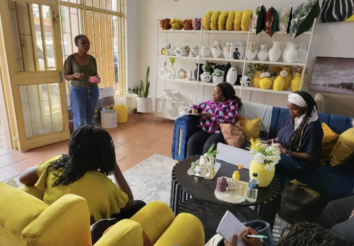 Photo: Chifuno Stevens (left) Managing Director for Dedza Pottery and Lodger and CEO of Chifuno Changa Green Initiative in Dedza interacting with Mastercard Foundation leadership- Makena Mworia and Phirista Nassali Nakato